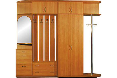 (колонка с зеркалом и обувницей или дверью), вешалка с крючками и ящиками (или с обувницей), шкаф 2-х дверный, вешалка со штангой + антресоли. + подсветка).