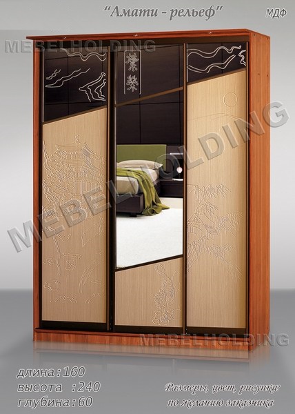 Особенности: направляющие - аналог "Командор",с соединительными горизонталями между МДФ и зеркалом с пескоструйной обработкой (с рисунком "Хижина")